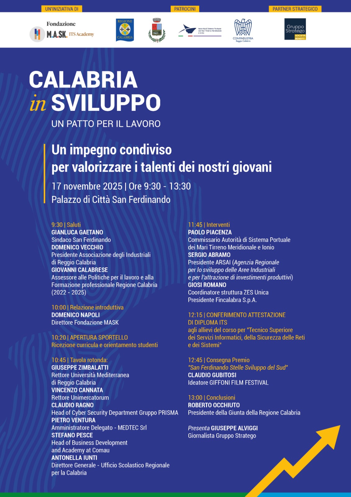 Lunedì 17 novembre, dalle ore 9:30 alle 13:30, presso il Palazzo di Città di San Ferdinando, si terrà “Calabria in Sviluppo. Un Patto per il Lavoro. Un impegno condiviso per valorizzare i talenti dei nostri giovani”, promossa dalla Fondazione Mask ITS Academy con il patrocinio della Regione Calabria, del Comune di San Ferdinando, dell’Autorità di Sistema Portuale dei Mari Tirreno Meridionale e Ionio e di Confindustria Reggio Calabria.